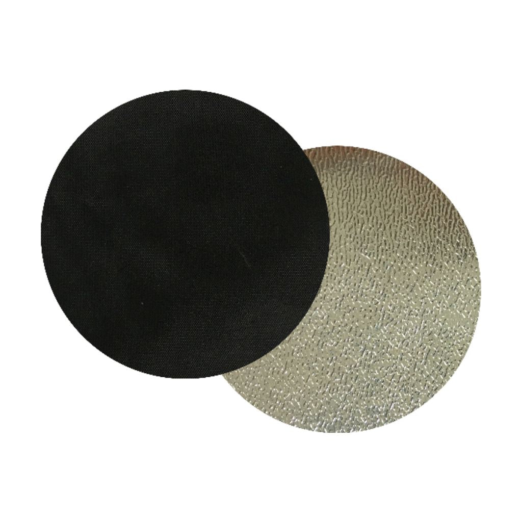 Erst kommt von Außen der schwarze Aufkleber auf das zu verschließende Loch, dann von innen der reflektierende Aufkleber.
